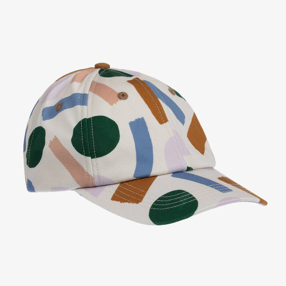 A light beige organic cotton cap for boys and girls from Danish brand Liewood. It is made in soft twill with an abstract paint stroke design in blue, green and brown. The designer's logo is embroidered on the back in dark green, and there is an adjustable buckle fastening on the back for a great fit.