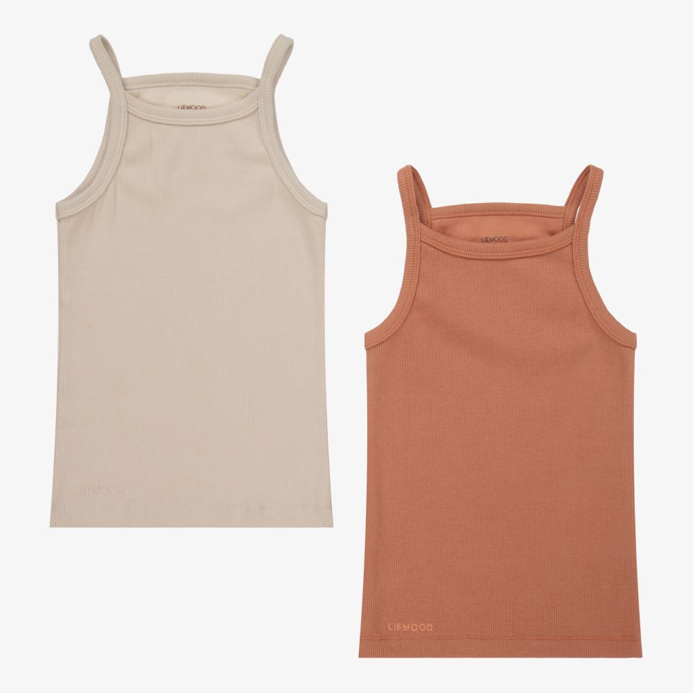 Girls pink and light beige vest tops by Liewood, made in ribbed organic cotton jersey. They have the designer's name in tone-on-tone embroidery on the front.