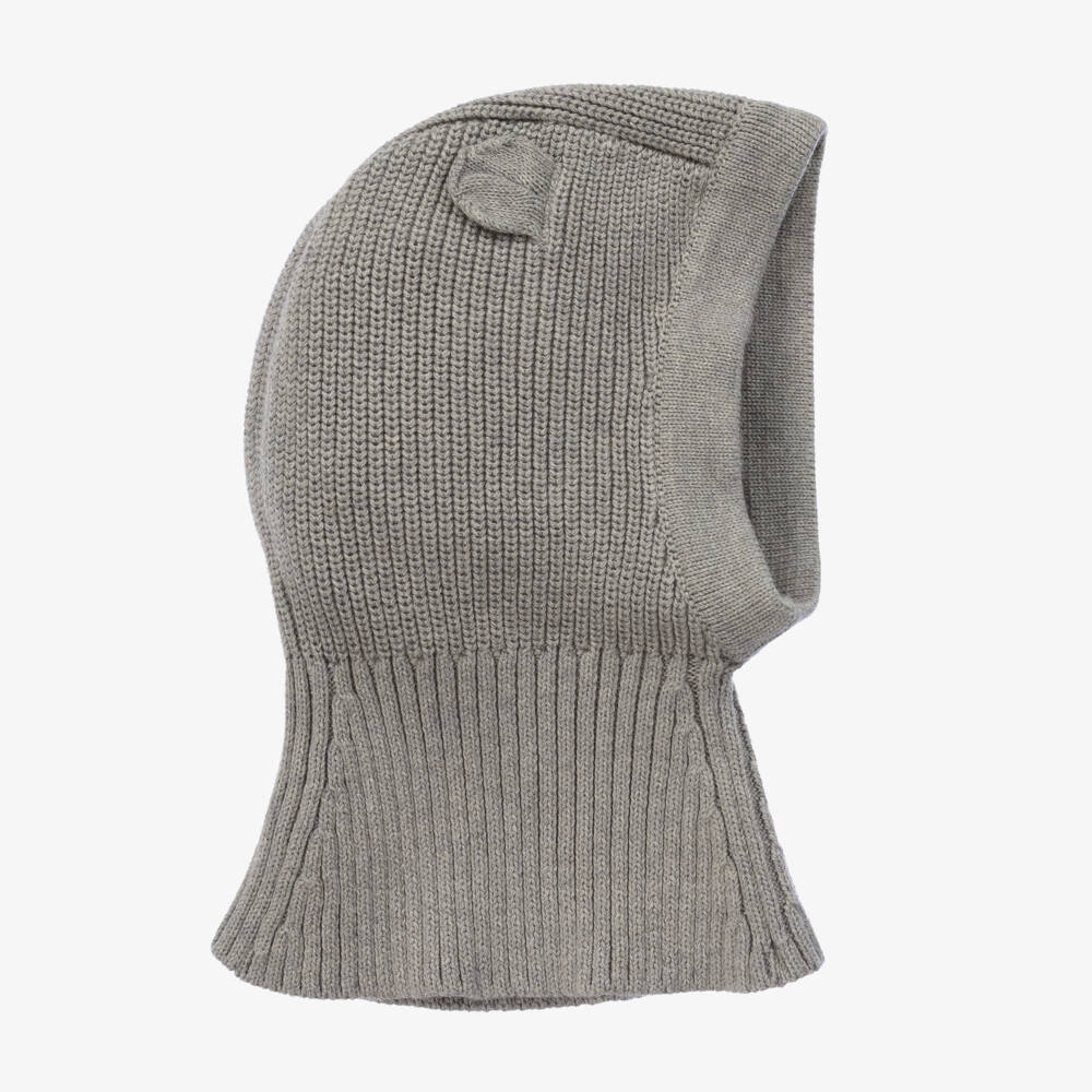 Grey balaclava for little boys and girls by Danish brand Liewood, in a soft organic cotton ribbed knit. Ideal as an added layer, this warm accessory has fun 3D ears on the top and a long ribbed neck. A branded logo tab can be seen on the back for a discreet designer detail.