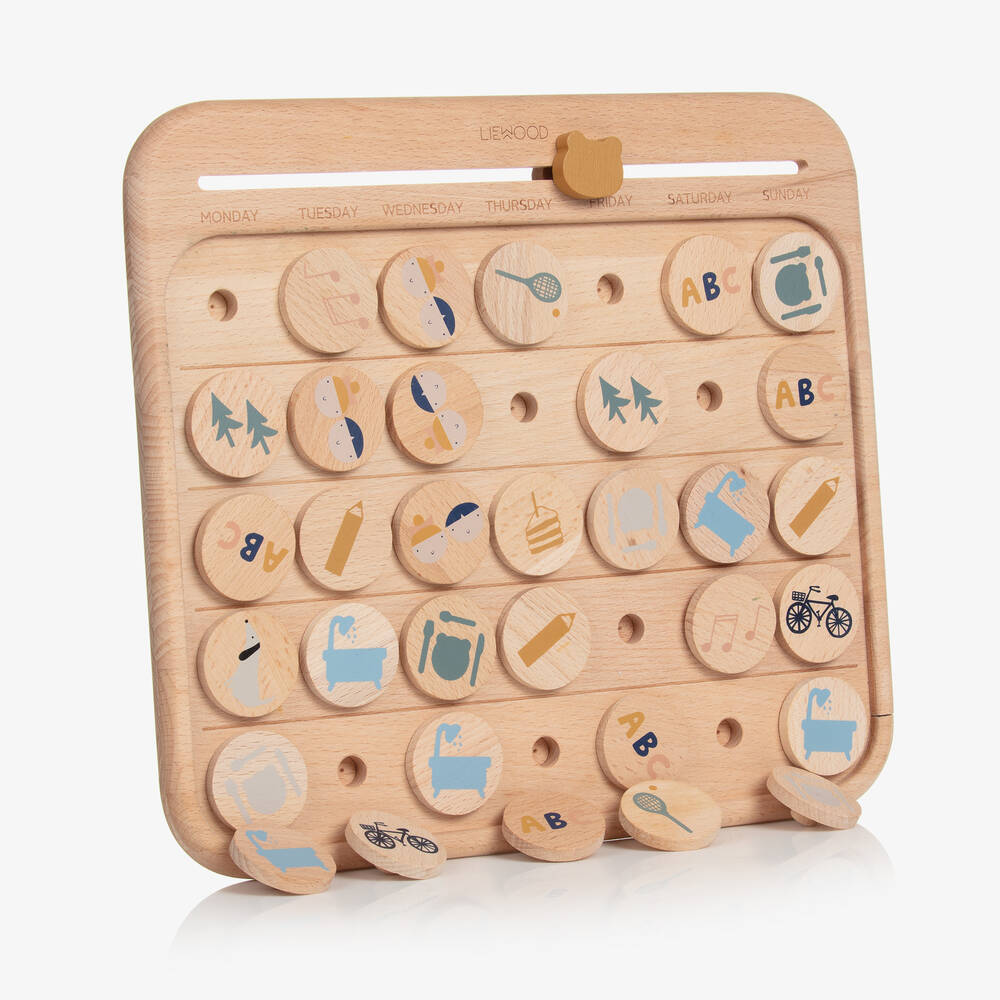 Fun wooden calendar for little boys and girls by Danish brand Liewood. Crafted in beech wood, it has the days of the week carved across the top and a teddy shaped slider to mark the day. There are 35 round, wooden, removable pegs, with colourful pictures to indicate the various activities your child will be doing during the day. This lovely interactive and educational set is a fun way to learn the days of the week.