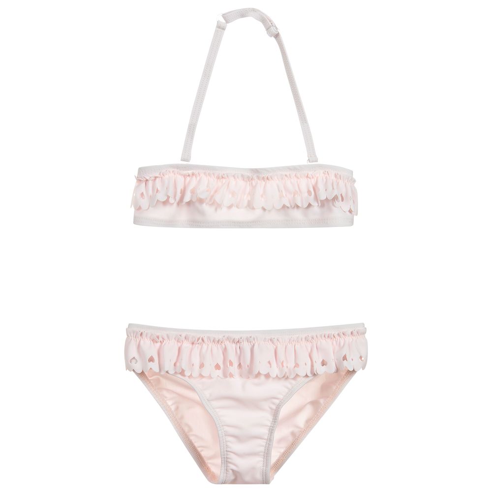 Pale pink bikini by Lili Gaufrette, made in soft, stretchy polyamide and trimmed with frills that have a pretty, cut-out heart pattern. The bandeau top has an adjustable, removable, halterneck strap, and fastens with a clasp on the back. It comes with a waterproof zipped pouch.