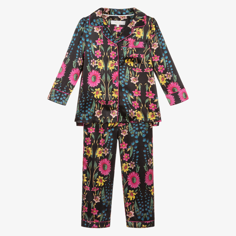 Girls Mini-me luxury black pyjamas by LiTTLE YOLKE. Made from soft and lightweight silk satin, the set has a colourful wildflower print. They have a front pocket and pink delicate piping trims. The top has covered button fastenings on the front and the bottoms have a drawstring waist with pockets on the sides.