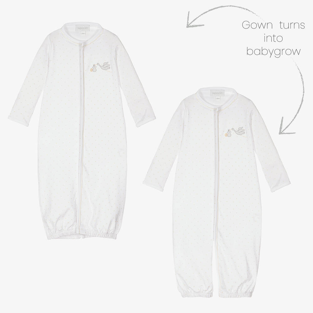 Magnolia Baby white long-sleeved converter gown for baby boys and girls. It is made from super soft Pima cotton with an ivory dot print. It may be worn as a gown with an elasticated hem and by adjusting the poppers it can be worn as a romper. The cuffs on the sleeves can also be turned over and worn as scratch mitts.