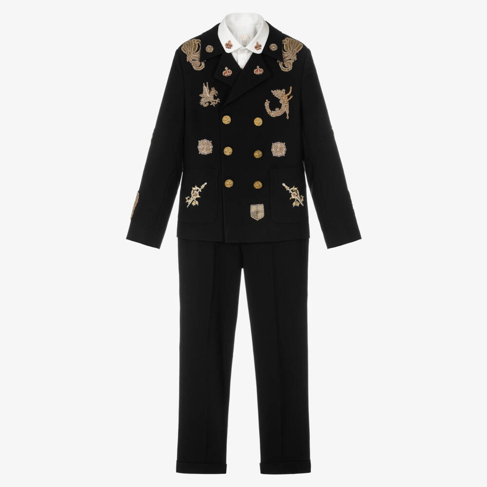 An ornate black suit for boys by luxury couture brand Maison Ava, made in a soft wool blend. Fastening with opulent gold buttons, the double-breasted blazer jacket is elegantly hand-embroidered on the front with intricate, gold baroque crests. For versatile wear, the suit set includes a pair of plain black shorts and trousers, with button and zip fastenings and adjustable waistbands to secure the perfect fit. Sleek and modern, the off-white cotton shirt is embroidered with royal crowns on the collar, for a harmonized finish.