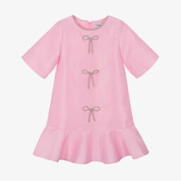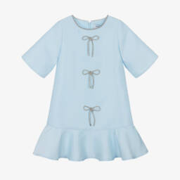 Exclusive to Childrensalon, this beautiful blue dress for girls by Mama Luma is made in lustrous satin twill with a subtle sheen. Lovely for a special occasion, this simple style is enhanced with three sparkling diamanté bows on the front and a matching trim around the neckline. Fully lined for comfort, it has a pretty flounce hem and concealed zip fastening.
