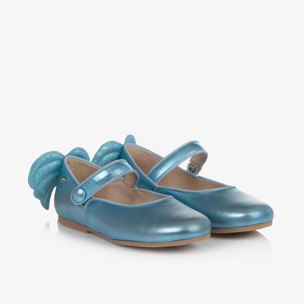 Girls beautiful metallic blue pumps by Manuela de Juan. They are handmade and fully lined in soft leather with a non-slip rubber sole. Trimmed with sparkly angel wings on the back, these pretty shoes fasten with a single popper.