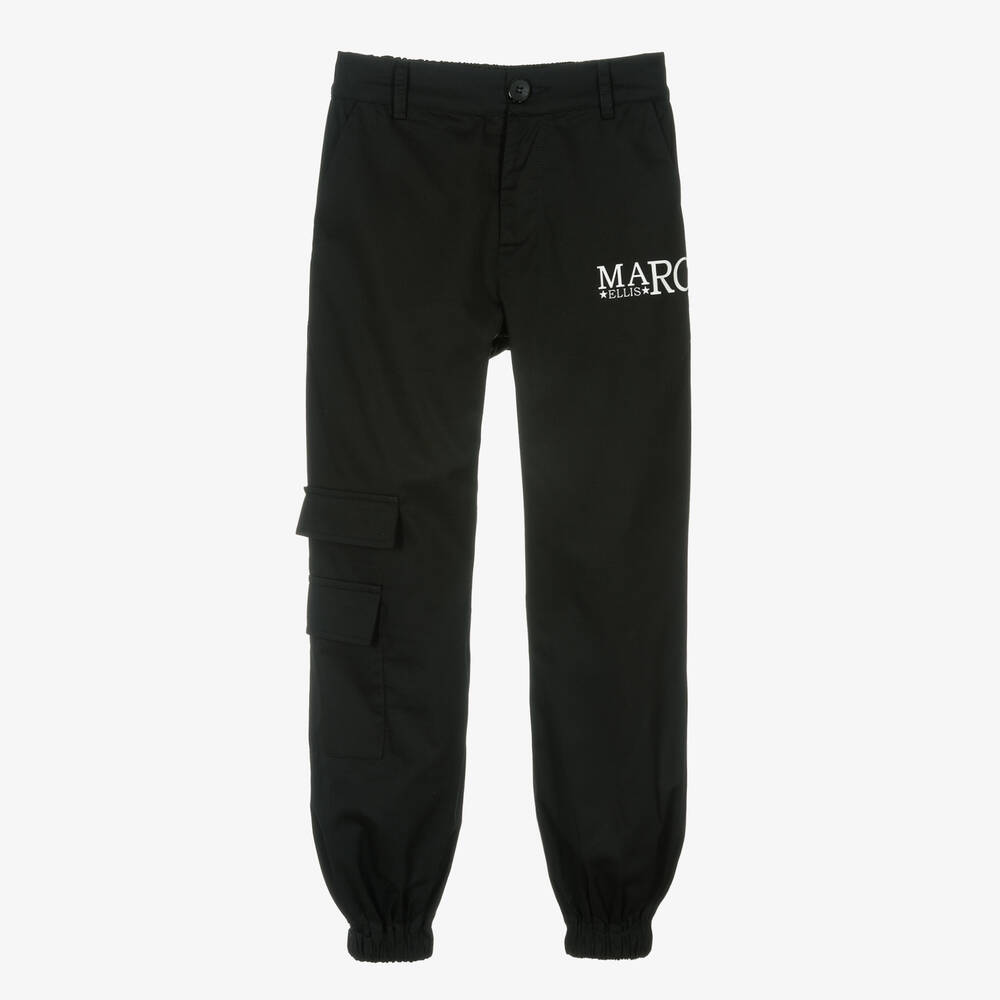 Cool black cargo trousers for girls from American designer Marc Ellis, made in smooth and lightweight cotton poplin. These cuffed trousers feature cool utility pockets on the leg, a part-elasticated waist for a comfortable fit, and handy front pockets. They fasten easily with a front button and zip, and label's stand-out white branding is stamped on the front for a designer touch.