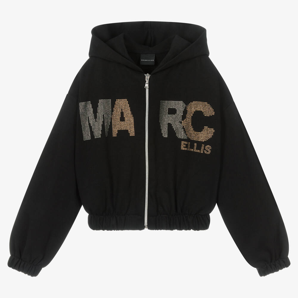Black hooded zip-up top for girls by Marc Ellis, made in mid-weight, cotton jersey. Relaxed with dropped sleeves, it has an exposed front zip fastening with a rhinestone embellished logo across the chest. It has an elasticated hemline and cuffs, and a large hood for a sporty, casual look.