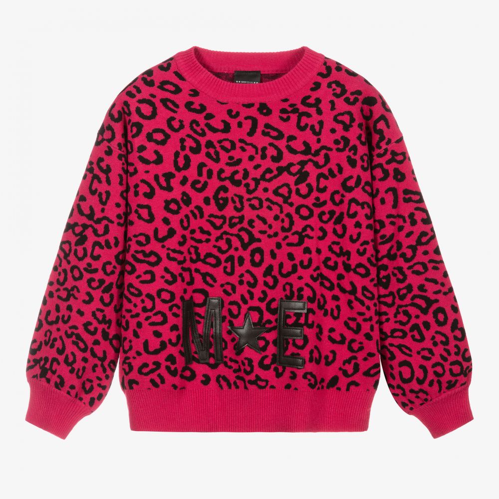 Fuchsia pink and black leopard sweater for girls by Marc Ellis. Knitted in a mid-weight soft and stretchy viscose blend in an oversized fit, the designer's initials are embroidered in black on the front.