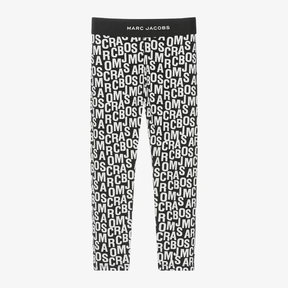 Eye-catching black and white leggings for girls by MARC JACOBS, patterned in the American brand's jumbled logo for a distinctive look. Made in soft and stretchy cotton jersey, these long-length leggings have a black, elasticated waistband with a white logo print at the front.