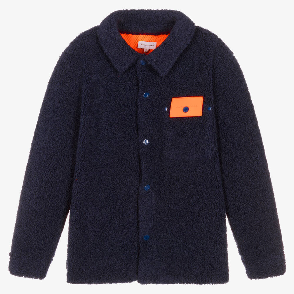 Stylish navy blue sherpa fleece jacket for teen boys by MARC JACOBS. For instant designer recognition, it has blue logo letters appliquéd across the back, outlined in orange for a bold look. For a coordinated finish, it has an orange mesh lining and a bright orange rubberised logo patch on the chest patch pocket, with branded popper fastenings, adding an extra designer touch.