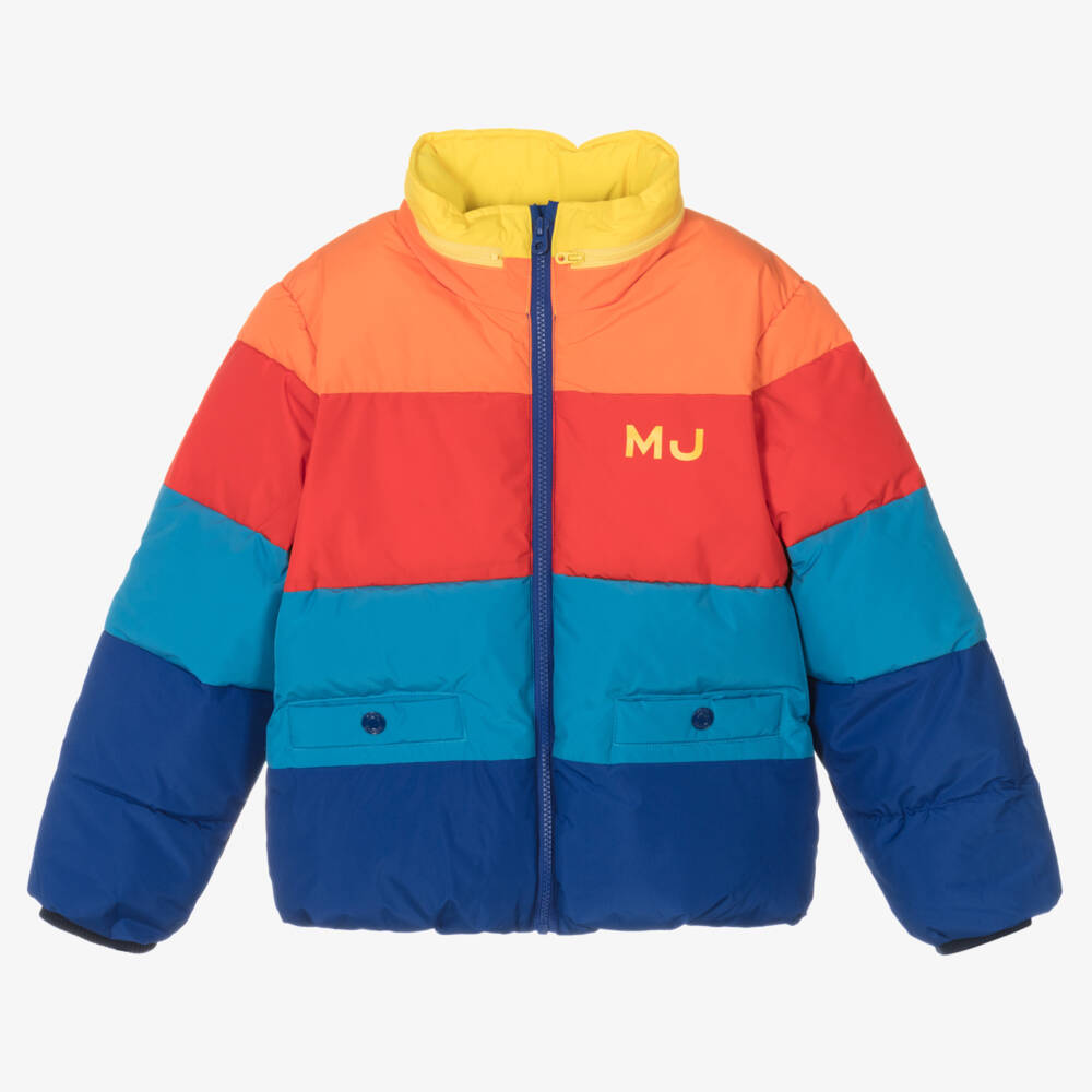 From American designer MARC JACOBS, a vibrant striped puffer jacket for teen boys in yellow, orange, red and blue. For instant designer appeal, it has bold yellow logo prints on the front and back. Made in silky smooth recycled fabric with a soft fleece lining and mid-weight padding, it has cosy ribbed cuffs and fleece-lined, popper-fastening pockets. There is a practical hood that packs away neatly inside the collar, secured with a zip fastening.