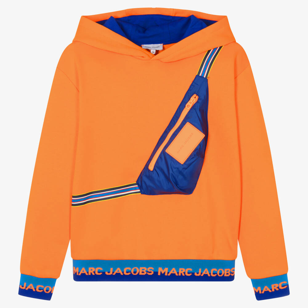 Bright orange hoodie for teen boys by MARC JACOBS, with the brand's zip-fastening silky blue belt bag on the front and a rubberised orange logo patch. Made in comfortable cotton-blend jersey, it has contrasting blue ribbed trims with orange jacquard logos for a distinctive designer finish.