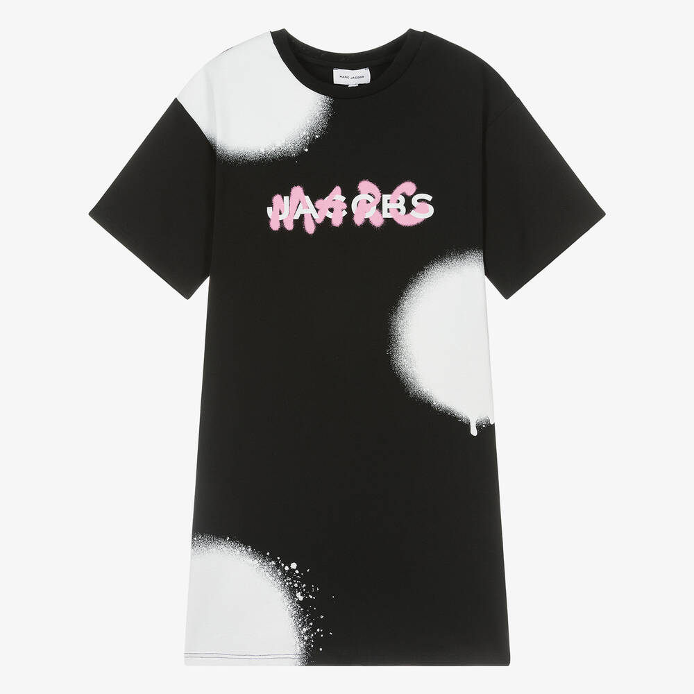 Black T-shirt dress for teen girls from MARC JACOBS, with white and pink graphics. Cool and edgy, this signature streetwear look is designed with oversized spray paint-effect dots and branding across the front. Super comfortable, this short-sleeved dress is made from soft, stretchy organic cotton jersey.