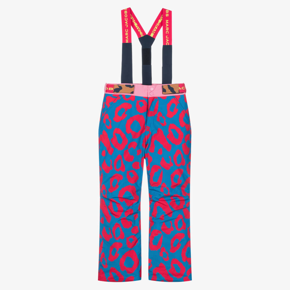 In a vibrant blue and fuchsia pink leopard print, these ski trousers for teen girls by MARC JACOBS are made in a silky smooth recycled fabric. They feature detachable and adjustable braces with neon yellow jacquard logos and elasticated shoulder panels. Padded from the knee up, they are lined in soft fleece and have internal snow gaiters to prevent snow from entering. There are useful pockets on the front, with a contrast leopard print popper fastening pocket on the back. They have popper and zip fastenings and adjustable velcro panels on the waistband for a secure fit.