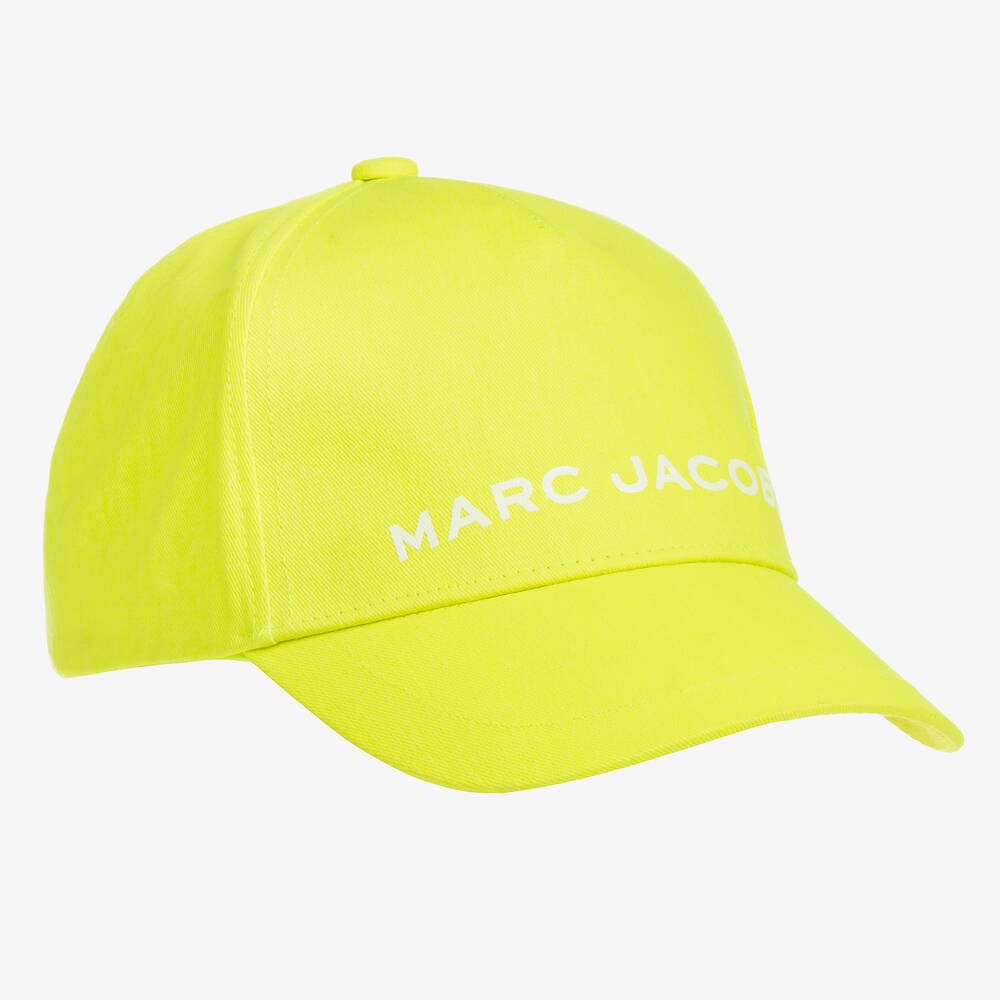 Mini-me cap for teen boys and girls in neon yellow from MARC JACOBS, with a white logo print on the front. It can be adjusted with the velcro strap on the back for a secure fit and has a large peak which protects eyes against the sun. Made in mid-weight cotton canvas, it is partially lined for added comfort.