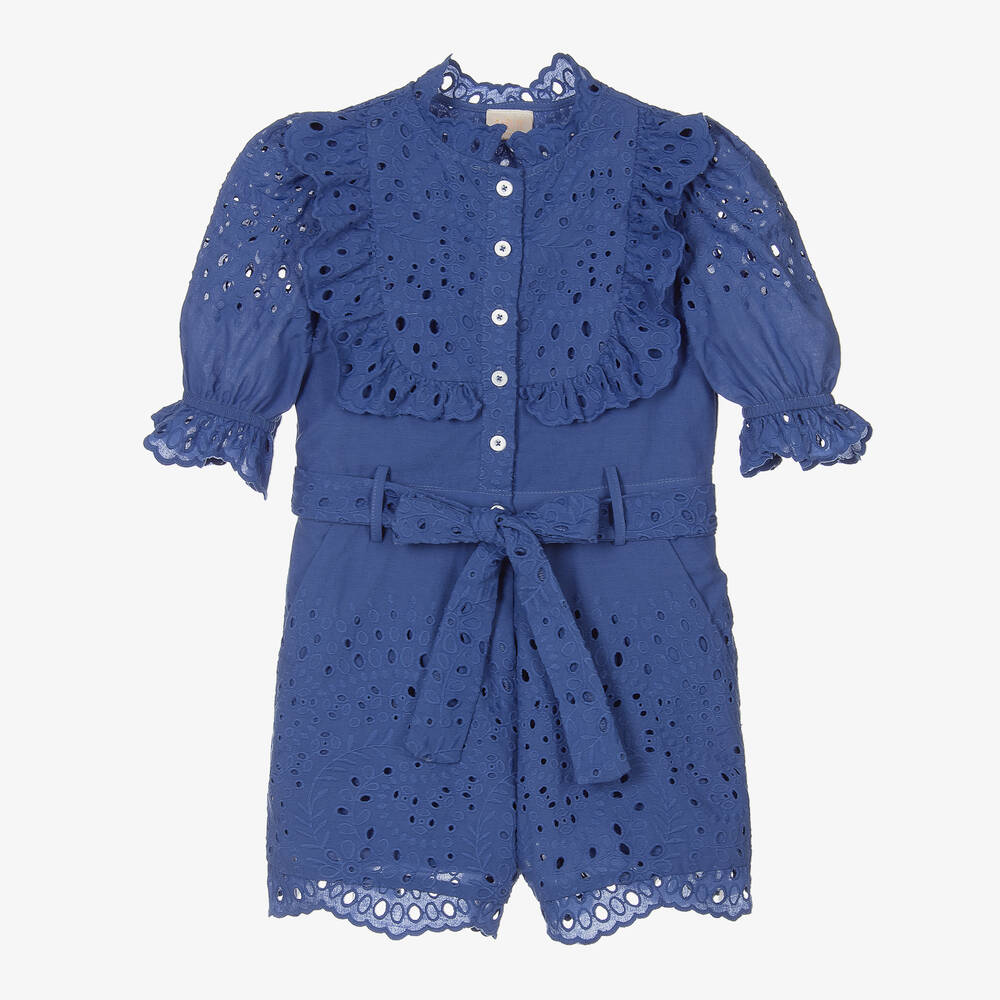 Cornflower blue playsuit for girls by Marlo Kids, woven from soft cotton fabric for a lightweight feel. For both casual and special occasions, this lovely piece has a bib front with a pretty floral cutwork design. The same detailing can be seen on the shoulders and legs. It has a scalloped neckline, slanted front pockets and a tie belt around the waist. The short sleeves are elasticated on the cuff and gently gather on the shoulder for a fuller look. Lined through the main body, this all-in-one fastens with pearlescent buttons on the front.