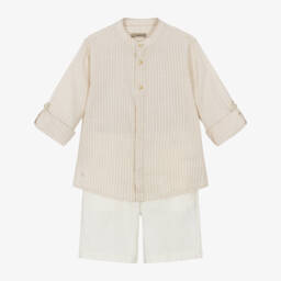 Smart beige shorts set for baby boys by Mayoral, ideal for special days. The white poplin shirt has an attached, cotton and linen blend waistcoat on the front with a little chest pocket. The matching beige shorts have fixed turned-up cuffs and an adjustable waistband for a great fit.