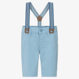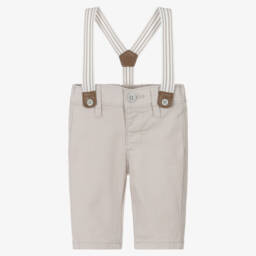 Beige trousers for baby boys by Mayoral, made in soft, lightweight cotton twill. Designed with an adjustable waist for a comfortable fit, they fasten with a single button and have faux pockets on the back. They come with detachable, striped elasticated braces for a sweet finish.