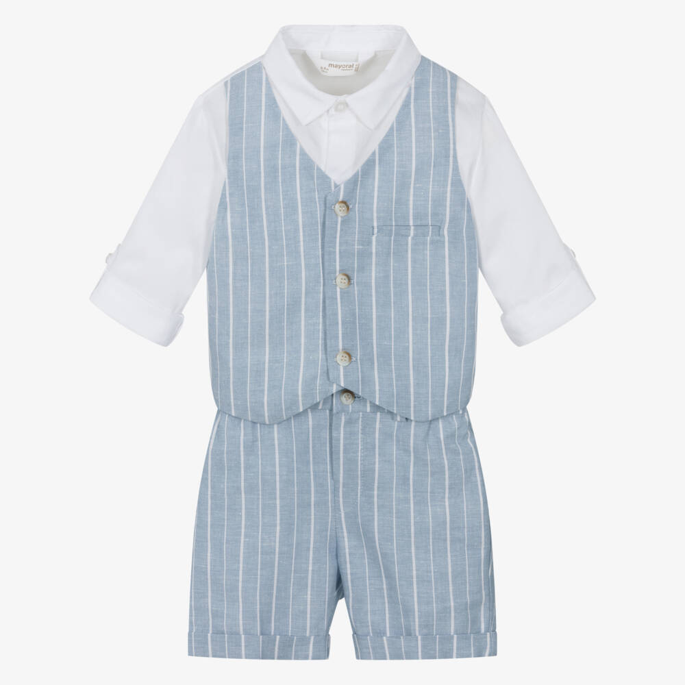 Smart blue shorts set for baby boys by Mayoral, ideal for special occasionas. The white cotton shirt has an attached waistcoat with neat button fastenings and a little chest pocket. The matching striped shorts have turned-up hems and an adjustable waistband for growing boys.