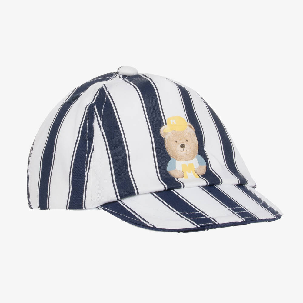 A sweet white and navy blue striped cap for baby boys by Mayoral, made in soft sustainable cotton twill. It has a stiff peak and cute printed bear on the front. Lined in a lightweight cotton blend for comfort, it secures with a velcro tab on the back.
