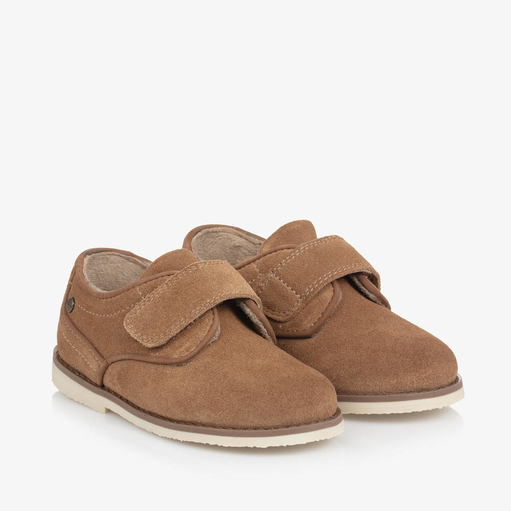 Smart brown shoes for baby boys by Mayoral, made in soft suede leather. They are comfortably lined in supple leather, with a cushioned leather insole and non-slip crêpe sole. The shoes fasten with a velcro strap across the foot.