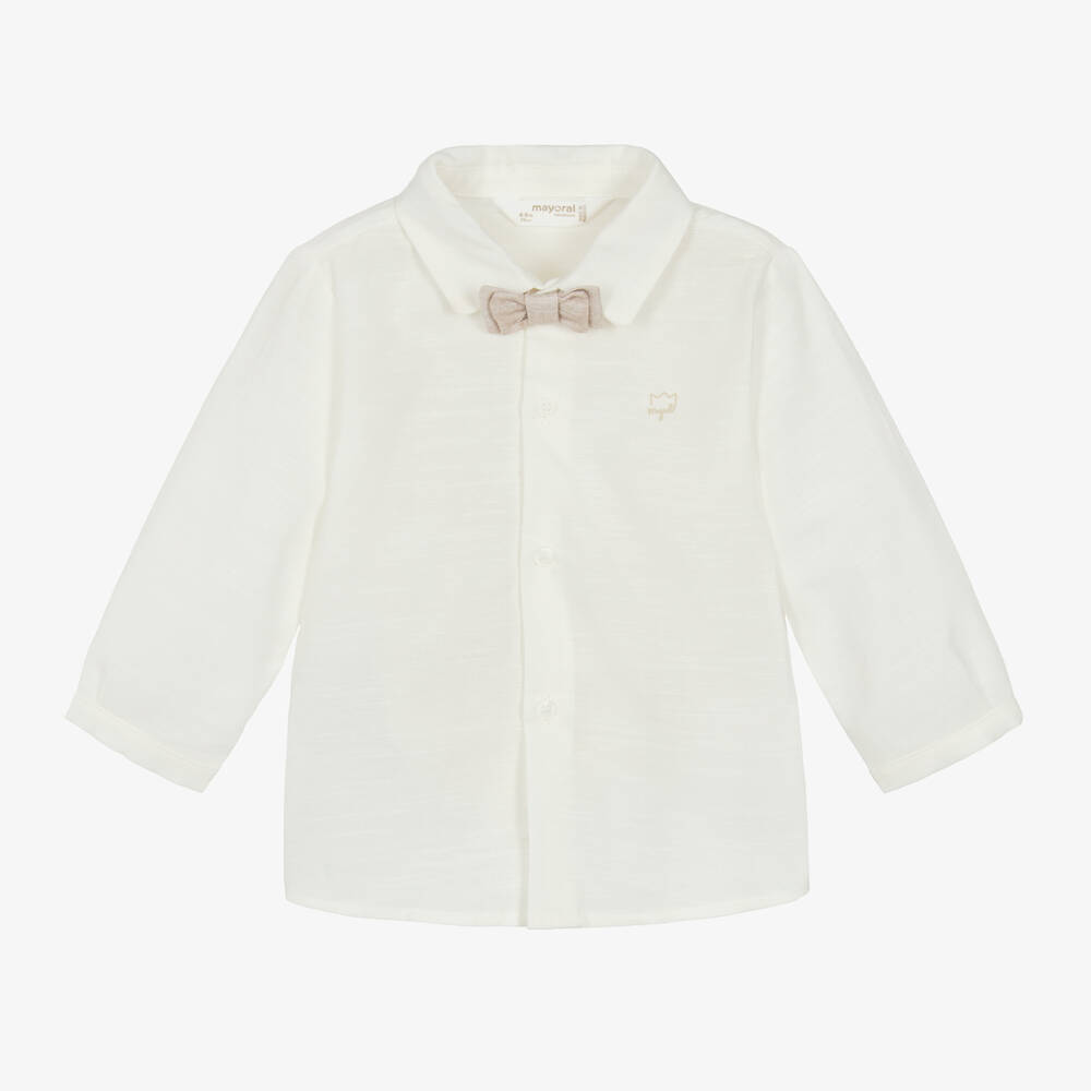 An ivory shirt for baby boys from Mayoral Newborn, made in breathable cotton and linen. This long-sleeved style has a subtle logo print on the chest and buttons to fasten on the front and cuffs for smartness. Included is an adjustable, velcro-securing bow tie, with elastic around the back to sit comfortably beneath the collar.