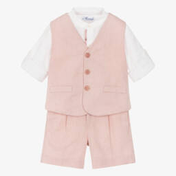 Smart ivory suit for baby boys from Mayoral, made in soft cotton blend Milano jersey. Both pieces have matching beige trims, faux pockets for style and pearlescent button fastenings. The single-breasted blazer has a cool, attached pocket square and a logo plaque. The trousers are adjustable on the waist for a comfortable fit.