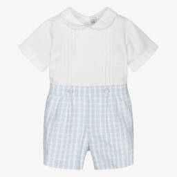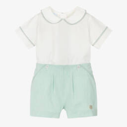 Smart and traditional, a white and blue shorts set for baby boys by Mayoral, designed with special occasions in mind. Made in a cotton and linen blend, the shirt has pintuck and lace detailing, with blue trims. It attaches to the lined shorts with buttons, keeping boys neat and tidy. A detachable, blue cummerbund-style belt completes the look.
