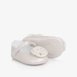 These adorable pre-walker shoes for baby girls by Mayoral are lovely for a special occasion. Made in glittery, ivory faux leather, they have a sweet tulle flower on the front, a gently padded insole and an adjustable velcro strap fastening. The flexible soles have heart-shaped rubberised pads for grip, making them ideal for little ones finding their feet.