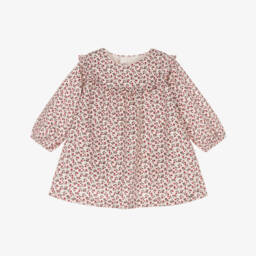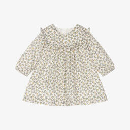 A charming ivory dress for baby girls by Mayoral, featuring a lovely green and yellow floral pattern. Made in soft and cosy velveteen fabric, it has a sweet ruffle trim and gently elasticated cuffs. Lined in lightweight cotton, it fastens neatly with a concealed zip on the back.