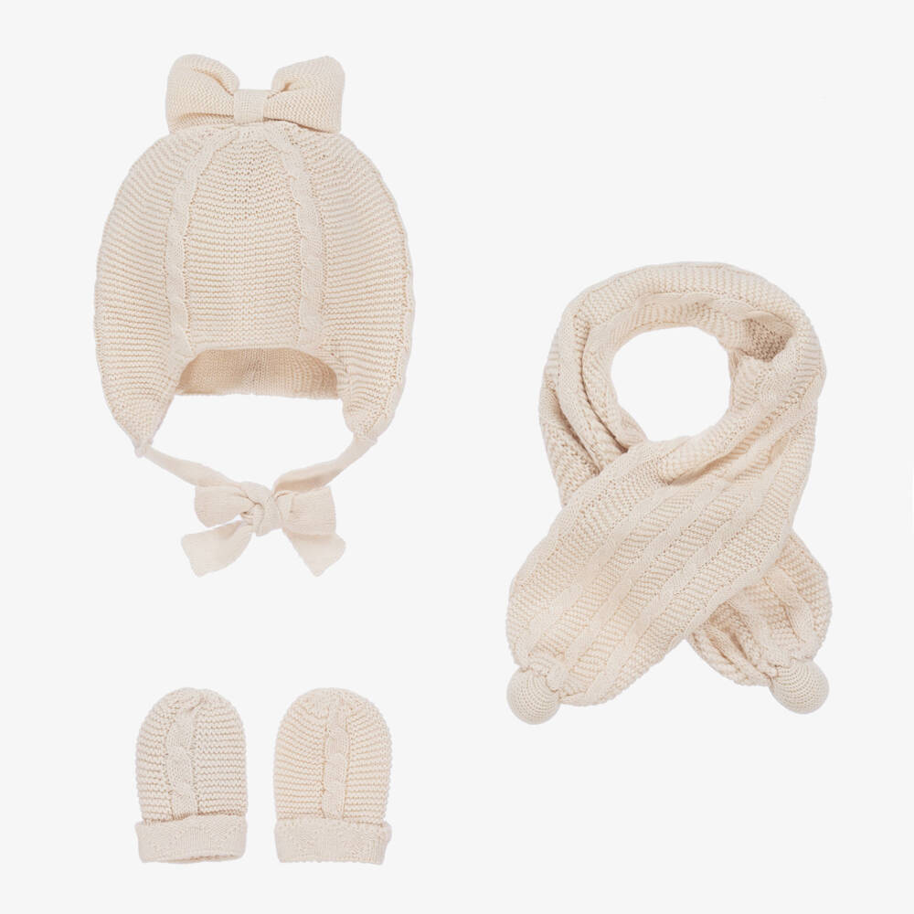 This lovely ivory hat set for baby girls is by Mayoral. With a charming cable pattern, each piece is softly knitted in pure cotton for ultimate on-the-skin comfort. The double-layer hat has a sweet bow on the top and ties to fasten under her little chin. The mittens have fold-over cuffs for a secure fit. With two layers, the scarf is trimmed with pom-poms and designed with a loop on the underside to help keep it in place.