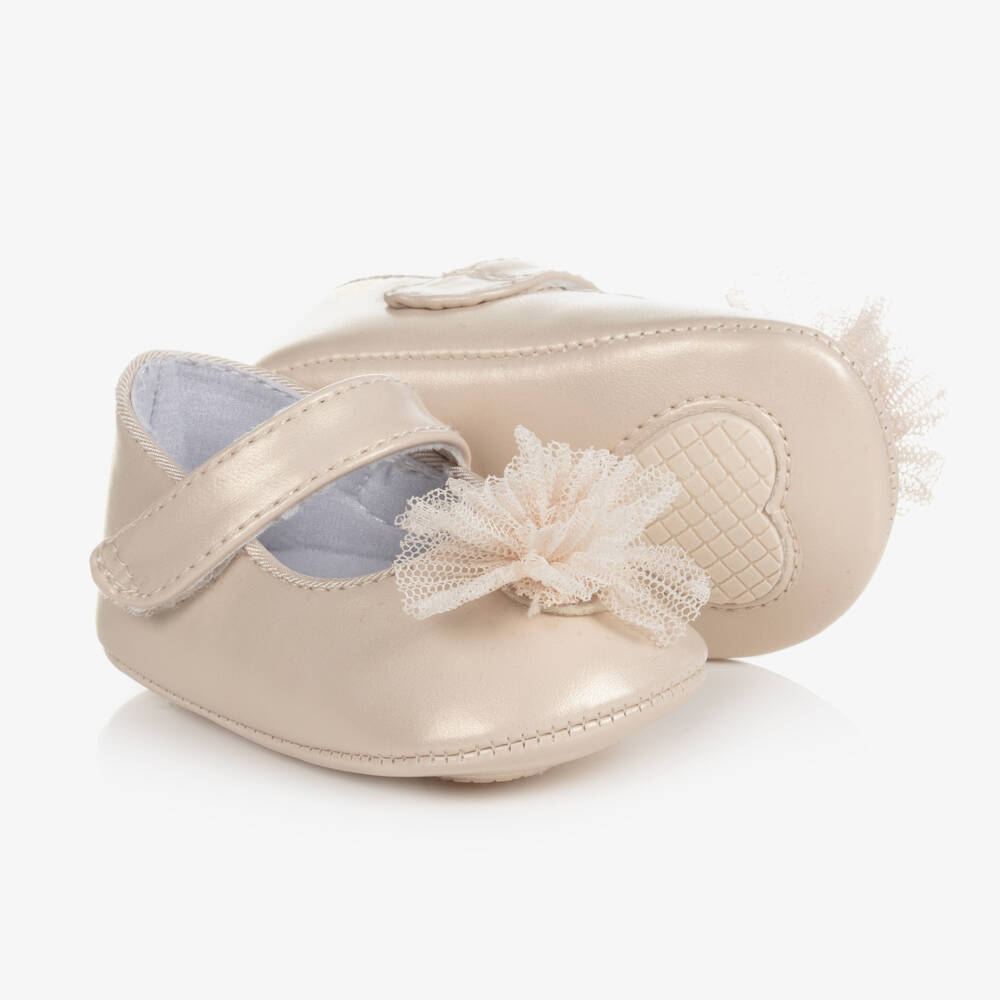 Sweet ivory pre-walker shoes for baby girls from Mayoral, with a subtle gold shimmer. They are made in faux leather which is flexible and durable and there is a velcro fastening strap across the foot for an adjustable fit. The soft soles have rubberised pads and tulle appliqués on the front give a cute finish.