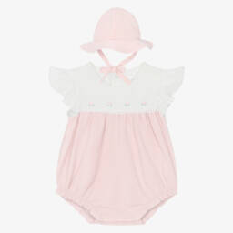 Adorable shortie and hat set for baby girls by Mayoral, featuring a charming design in pink and white. Made in soft cotton jersey, the shortie has delicate, short ruffled sleeves and an embroidered flower motif on the chest. It fastens with poppers on the back and between the legs. The coordinating hat has a soft brim and ties under the chin to keep it securely in place.