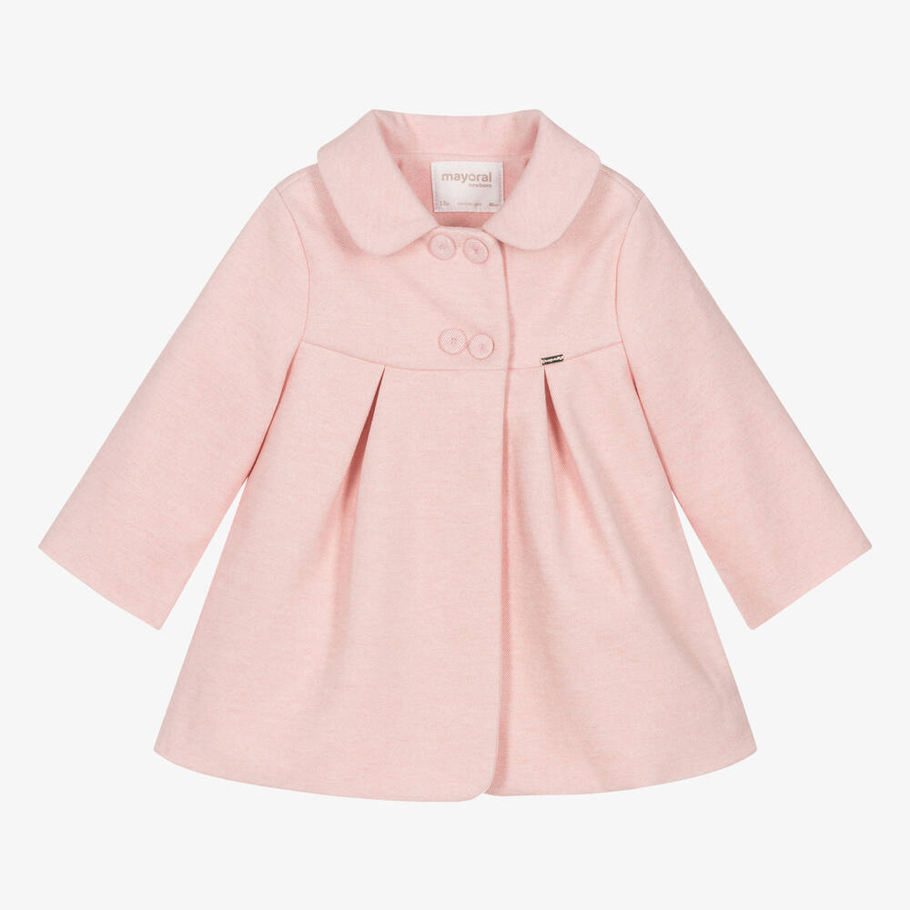 Cute pink coat for baby girls by Mayoral, made in beautifully soft woven fabric. Timeless and elegant, it has a stylish trapeze shape and fastens with concealed poppers and double-breasted covered buttons. Lined with a super soft plush fleece for extra comfort, it has a charming collar and a tiny gold logo tag on the front for a subtle designer finish.