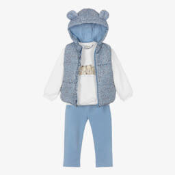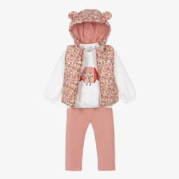 Charming dusky pink and ivory trouser set for baby girls by Mayoral, made in soft cotton jersey, combining comfort and style. The cosy, long-sleeved sweatshirt features a playful bird appliqué, with popper fastenings on the shoulder to help with dressing. The trousers have a gentle stretch for ease of movement and an elasticated waistband for a snug fit. Completing the set is a delightful, floral-patterned gilet with a full zip fastening and an adorable hood with bear ears.