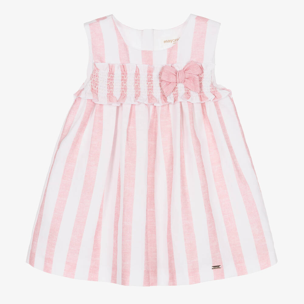 Pale pink and white striped dress for baby girls by Mayoral, made in a lightweight cotton and linen blend. A sweet summer piece, this sleeveless dress has a ruffle trim on the chest, decorated with smocked detailing and a pretty bow. Fastening with a zip on the back, it has a small logo charm on the hemline for a subtle branded touch. It is fully lined for comfort and comes with a pair of matching knickers for a complete look.
