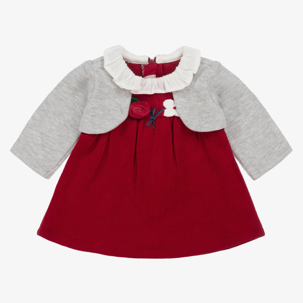 Gorgeous red dress for baby girls by Mayoral, made in a soft brushed cotton jersey. This sweet dress has an attached grey cardigan to give the impression of a two-piece. It has a pretty white ruffle collar and lovely 3D flower appliqués on the front. For a neat finish, it has a concealed zip fastening at the back.