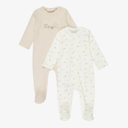 Набор из двух комбинезонов для мальчиков от Mayoral из мягкого хлопкового трикотажа. Один комбинезон украшен принтом с сафари-животными в бежевых и голубых тонах, другое - милыми мотивами со слоном, зеброй и жирафом. Оба изделия застегиваются на кнопки спереди и между ножек для удобства одевания.