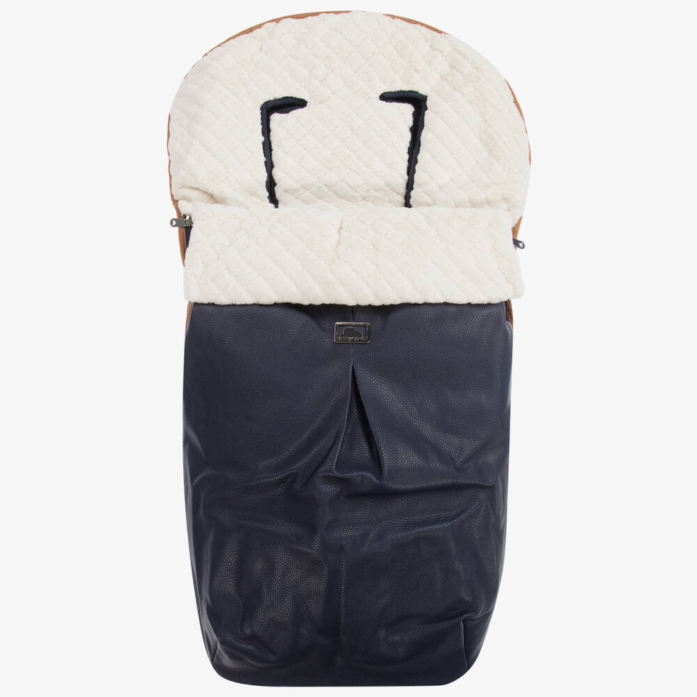 A softly padded, navy blue and ivory baby nest by Mayoral Newborn, for use in a car seat. The faux leather front unzips on both sides for easy access and reveals the plush fleece lining beneath. The backing hooks over the car seat and it has velcro fastening holes for shoulder straps.