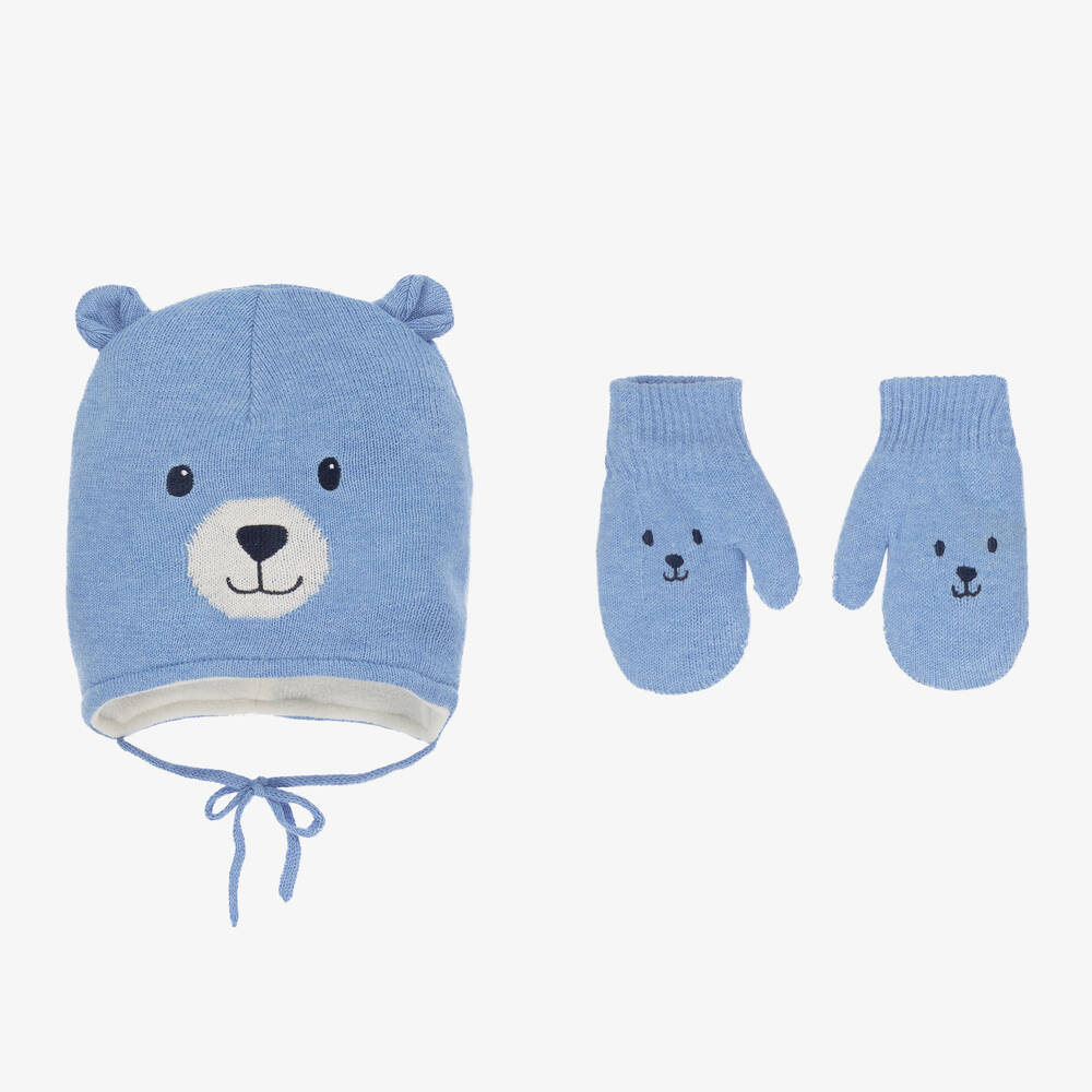 Sweet hat and mittens set for little boys and girls by Mayoral, knitted in a soft cotton and wool blend. Both the hat and mittens are lined in cosy polar fleece for extra warmth and have cute bear faces embroidered on the front. The hat has fun 3D ears on top and ties to secure under the chin.