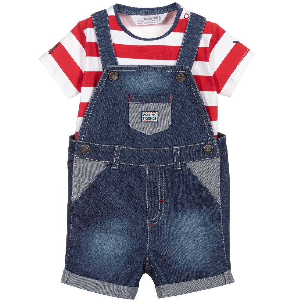 Sweet dungaree set for baby boys and girls by Mayoral Newborn. Made in worn look jersey denim, the blue dungarees have useful adjustable shoulder straps. They come with a red and white striped cotton jersey T-shirt with popper fastenings on one shoulder.