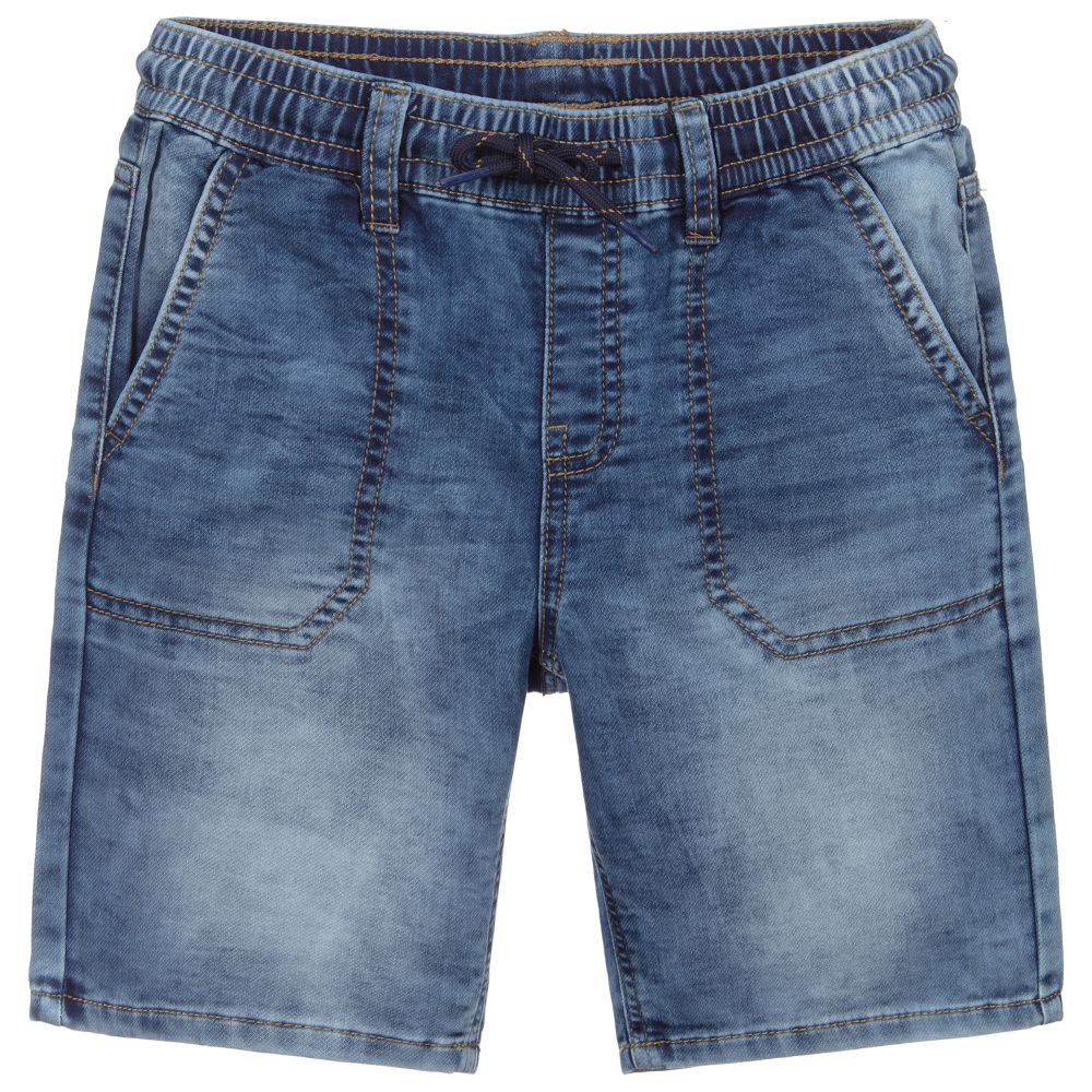 Stone wash Bermuda length shorts for junior boys by Mayoral Nukutavake, with faded patches on the front and back. Made in soft and stretchy organic cotton, they have the look of denim with the comfort of jersey. They have front and back pockets and an elasticated drawstring waist.