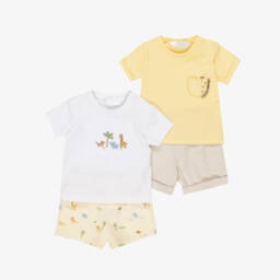 Blue shorts set for younger boys by Mayoral, made in comfortable cotton jersey. This casual outfit set includes a short-sleeved T-shirt with fun surfboard characters printed on the front. There are neat popper fastenings on one shoulder to help with dressing. The paired shorts are made in slub jersey with a simple drawstring waist.