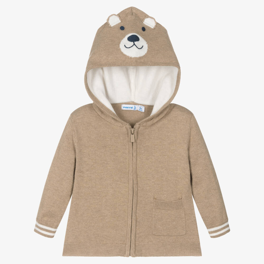 A dark beige cotton zip-up top for younger boys by Mayoral. Absolutely adorable, it has a fully lined hood with a cute teddy bear face and little ears. Soft and cosy, it is made with a touch of wool, has ivory stripe details on the cuffs, and a patch pocket on one side.