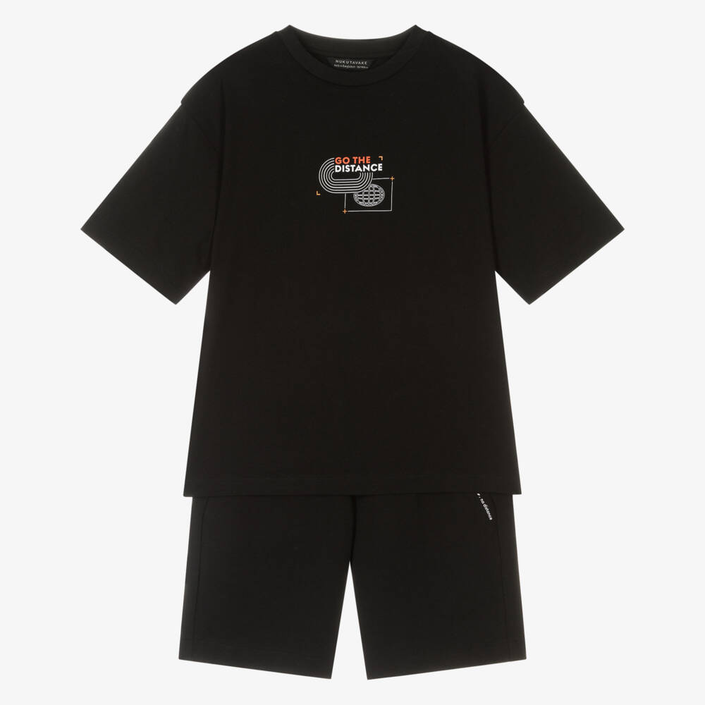 Casual black shorts set for older boys by Mayoral Nukutavake, made in soft, comfortable cotton jersey. The short-sleeved tee has a crew neckline and cool track-inspired graphics on the front and back, with the 'Go The Distance' slogan. Matching shorts have slanted front pockets, a concealed back pocket and an easy drawstring waist for an ideal fit.