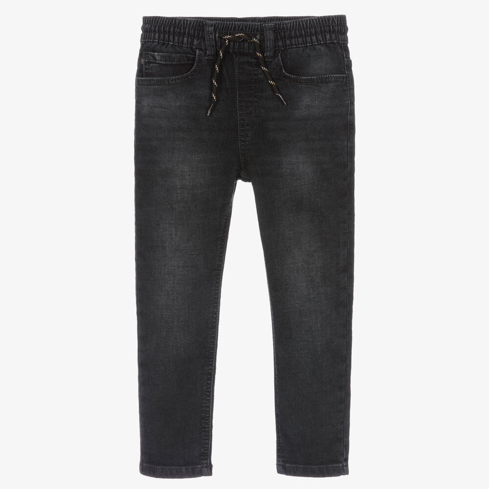 Black jogger-fit jeans for boys by Mayoral, with a washed and worn look. Made in a sustainable cotton blend with the comfort of jersey and the look of denim, they have classic five-pocket styling with an elasticated, drawstring waist. There is a fabric logo tab sewn around the back, striped in yellow, white and black.