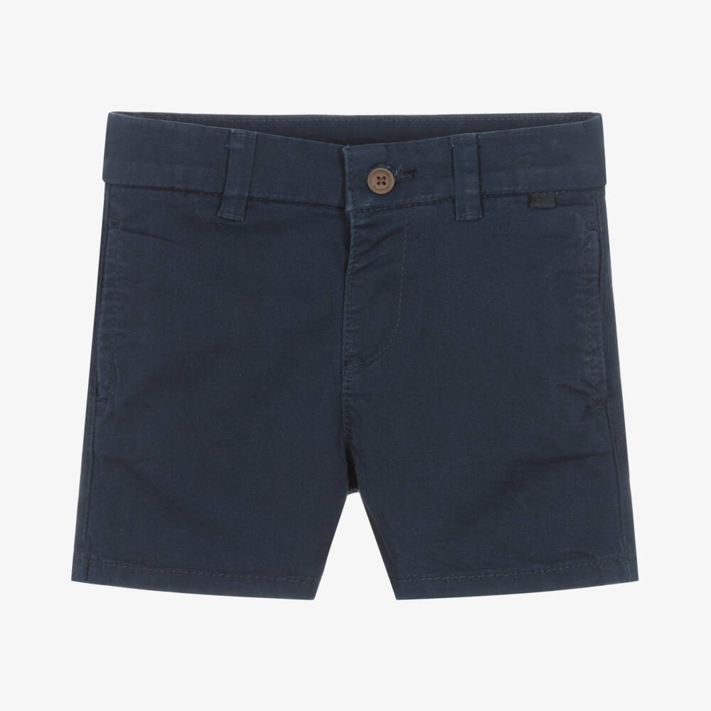 Casual navy blue chino shorts for little boys by Spanish brand Mayoral, made in sustainable cotton. They have a button fastening, and an adjustable waist for a great fit, with concealed side pockets and buttoned back pockets.