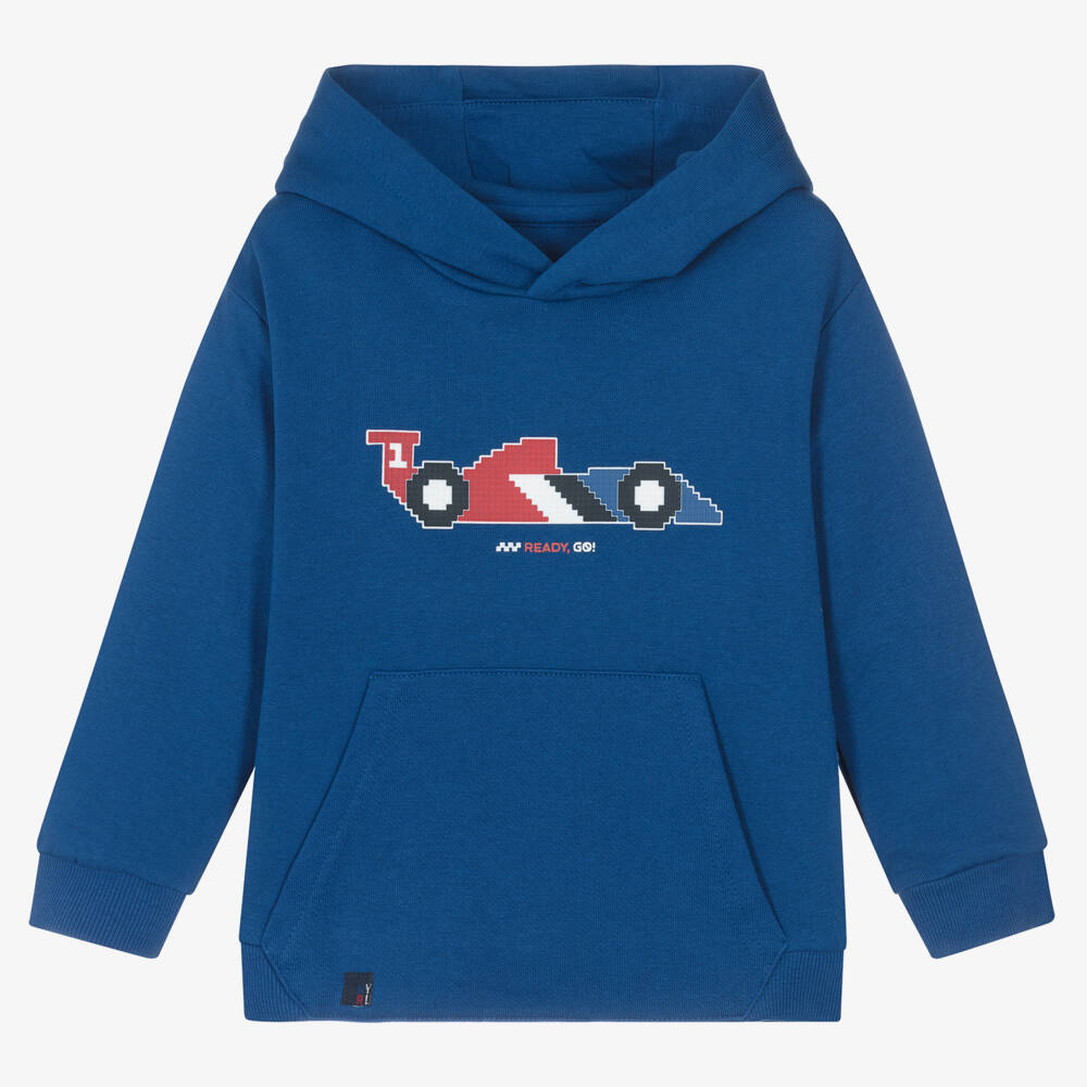 Royal blue hoodie for boys by Mayoral, made from a soft cotton jersey blend with a fleecy inside. In an easy regular fit, this casual layer has a pixelated racing car design on the front with rubberised, raised studs. It has a spacious pouch pocket on the front and ribbed cuffs on the long sleeves for extra comfort.