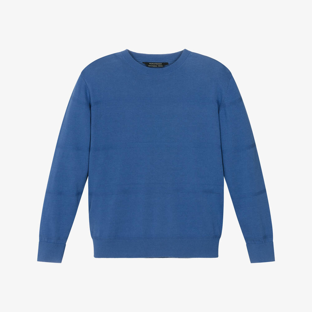 Mid-blue cotton sweater for older boys by Mayoral Nukutavake, with a ribbed stripe in the knit. Soft and lightweight, it makes an ideal extra layer for cooler days.